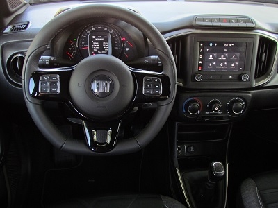 Os tempos das picapes compactas de cabine dupla com bancos traseiros acochambrados e de aspecto um tanto tosco ficaram no passado na linha Strada. A versão com cabine dupla da geração anterior, com porta traseira apenas do lado direito, levava só dois passageiros atrás, em um espaço exíguo e recomendável apenas para viagens rápidas. Na nova versão cabine dupla da picape da Fiat, o banco traseiro acomoda três adultos com conforto similar ao proporcionado pelo hatch Argo. As portas dianteiras se abrem em 70 graus e as traseiras, em 80 graus, para facilitar o acesso. O passageiro do banco central também conta com cinto de três pontos e encosto de cabeça. No acabamento interno, apesar da Volcano ser uma versão topo de linha, os mesmos plásticos duros das configurações básicas estão presentes em todo o painel e nas portas.