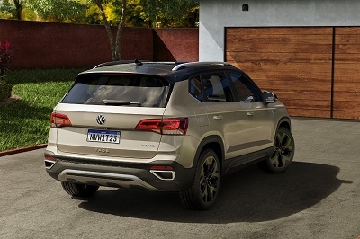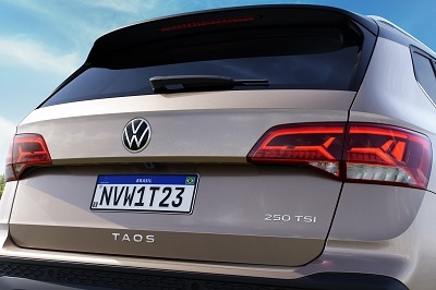 Um dos pontos do Taos considerados como importantes pela Volkswagen é seu design que, conforme a marca, evoca uma silhueta típica dos SUVs, transmitindo uma imagem sólida e robusta. Se realçam as caixas de roda quadradas com os cantos arredondados, enquanto os para-choques “musculosos” aumentam a sensação de força do conjunto. As dimensões do Taos – 4,47 metros de comprimento, 1,84 metro de largura, 1,62 metro de altura e 2,68 metros de distância de entre-eixos – deixam o veículo sutilmente maior que o concorrente Compass. Na frente, o utilitário esportivo médio mostra uma elevação acentuada, ao lado das linhas angulares no para-choque. O Taos estreia uma nova assinatura noturna da marca, conectando os faróis com uma linha de luz de leds que percorre a grade de um lado ao outro. Essa mesma “ponte de leds” se repete na parte de trás do veículo.
