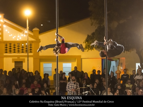 Em cena, performances simultâneas entram em jogo em inter-relações diversas: o mastro chinês, o trapézio fixo, a lira, o malabares, a acrobacia de solo, o mão-a-mão e a música ao vivo. Na Esquina camufla as dinâmicas dos ensaios, falseia e assume processos preparatórios, rompe a previsibilidade entre o que deve ser mostrado e o que é excluído num espetáculo.
